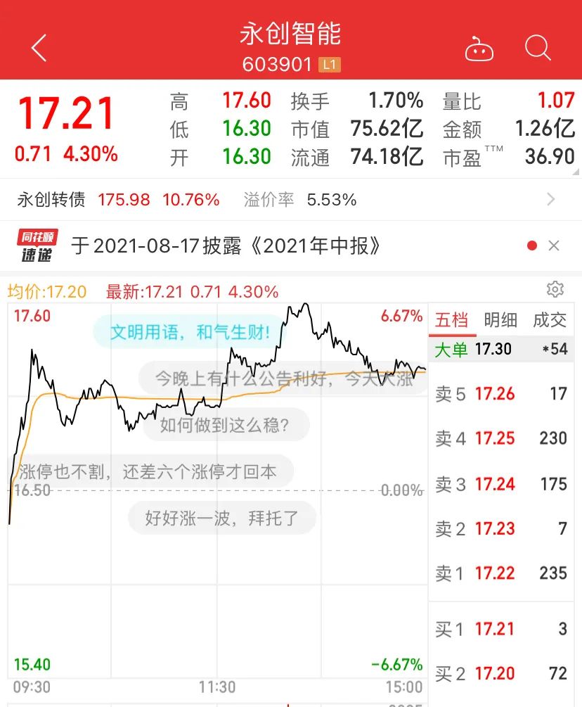 永创转债对应的正股永创智能的股票自2021年4月20日至2021年6月3日连续30个交易日内有15个交易日收盘价格高于(或不低于)“永创转债”当期转股价格的130%,已满足“永创转债”的赎回条件。网友:盘子小被炒作