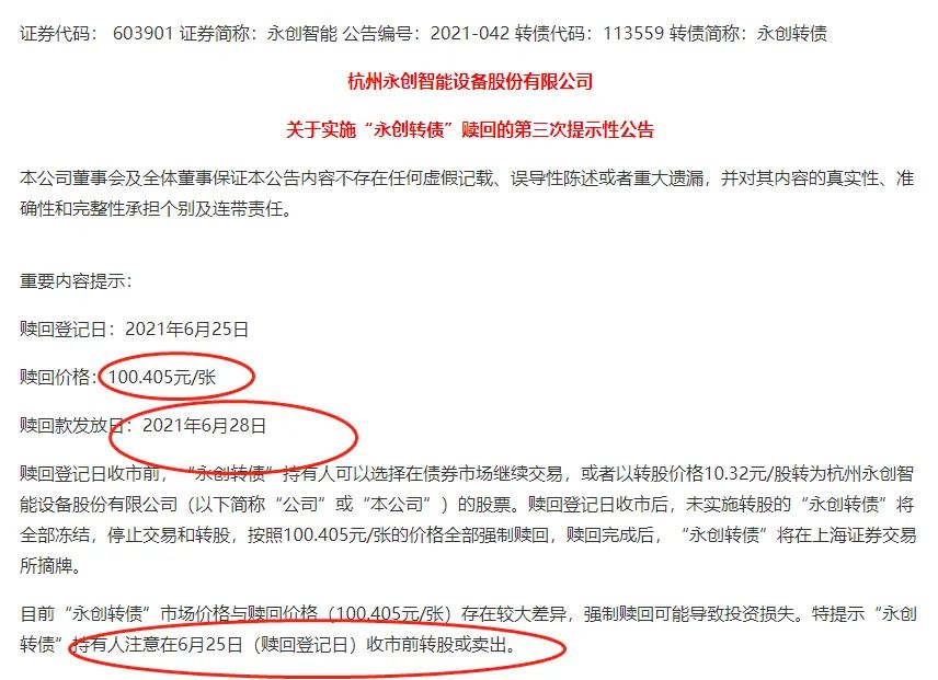 触发强制赎回的永创转债,今天6月25日进入到最后一个交易日,也是赎回登记日,下个交易日(6月28日)将摘牌停止交易及转股,并按照赎回价格发放赎回款。