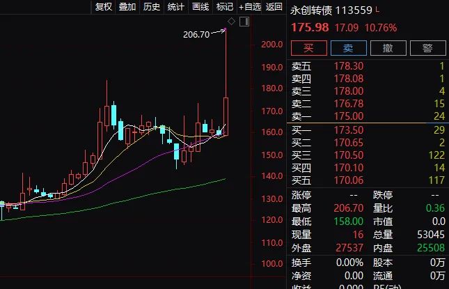 最后3分钟,永创转债又上演疯狂出逃,价格断崖下跌,从206.7元跌倒175.98元,跌14.86%。今天,永创转债的正股永创智能只涨了4.3%,转债涨幅明显异常,今天收盘转股价值为166.76元,高价买入即使转股也要亏19.32%。