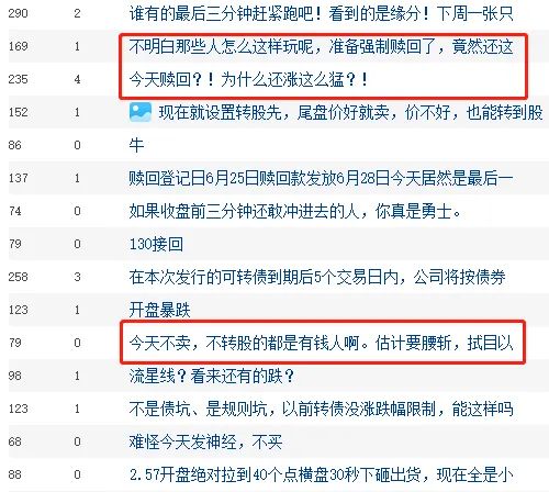 网友也对今天永创转债的表现目瞪口呆,看不懂博傻资金这么操作。有网友也认为,盘子小是被炒作的重要原因,也有网友表示,今天没卖没转股将面临腰斩。