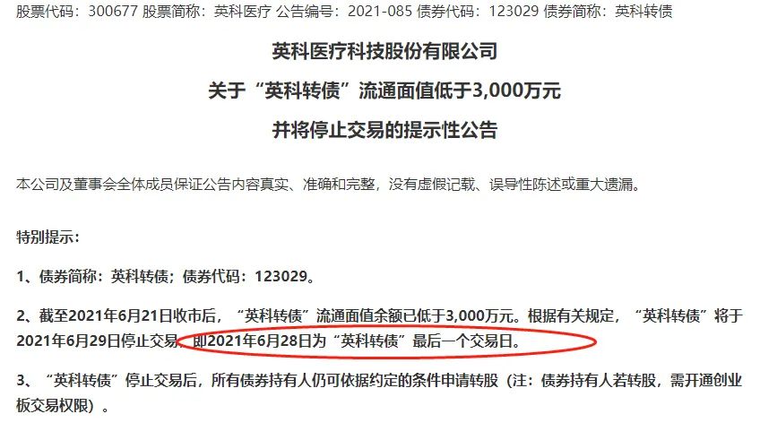 截至2021年6月21日收市后,“英科转债”流通面值余额2973.37万元,已低于3000万元。根据有关规定,自本公告刊登之日起3个交易日后(2021年6月29日),“英科转债”将停止交易。原标题:《“末日”疯狂!暴拉30%两“熔断”,又3分钟砸15%!瞎炒要亏超50%,紧急提示:曾经3600元的“债王”还剩1天退市》