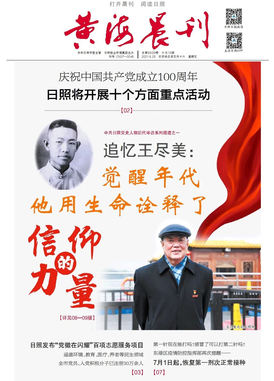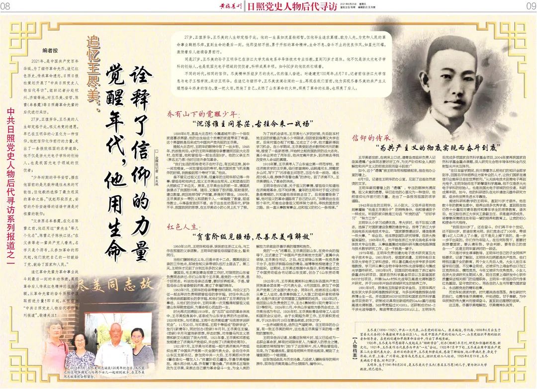 中共日照党史人物后代采访系列报道之一2021年,是中国共产党百年华诞。为了缅怀革命先烈,追忆红色历史,传承革命遗志,日照日报社策划开展了“中共日照党史人物后代寻访”,组织记者分赴杭州、济南等地,对王尽美、安哲、陈雷(牟春霆)等日照籍革命先辈的后代进行采访。