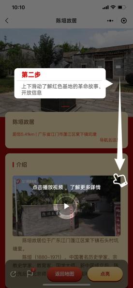 大家可以在手绘地图上选择江门市红色基地,了解红色基地的革命故事、预约信息等。按照小程序上的指引方式进行预约、前往实地参观,并登录小程序“点亮”该红色基地。探寻革命先烈的足迹,加深对党史的理解,感受江门市深厚的红色文化历史。