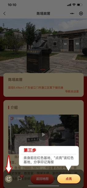 亲身前往红色基地,在该红色基地1公里范围内,可“点亮”该红色基地,生成带有基地手绘图的分享海报,并分享给微信好友。