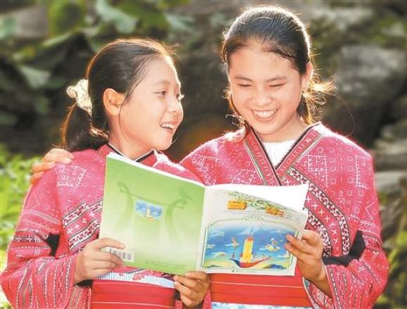 ▲“春蕾计划”实施以来,在社会各界的支持和帮助下,越来越多偏远山区女童实现了读书的梦想,该计划也成为我国促进女童教育与发展的成功范例。图为龙胜各族自治县泗水乡两名春蕾女童在开学季领到新课本。6月6日,高考前一天,融水苗族自治县中学的高三学生石璐收到该县妇联主席姚丽翠发来的信息,为她高考加油鼓劲。