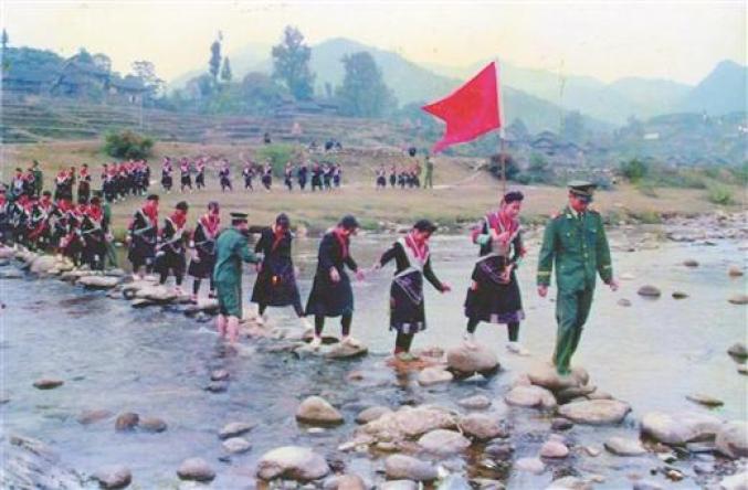 ▲上个世纪90年代,融水苗族自治县红瑶女童班的学生走出大山翻山越岭求学,武警官兵一路护送。武警柳州支队一代代官兵接续对红瑶女童进行教育扶持,帮助众多女童圆了读书梦。