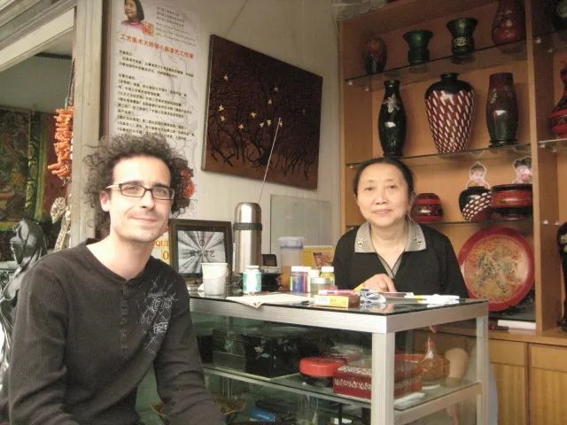 在2008年5月的一张合影里,身着唐装的文森,和老师邹小屏分别拿着的大漆盘,就是他交的作业。这两只盘子,一只文森带回了法国,另一只送给了邹小屏,现在还在她家里。