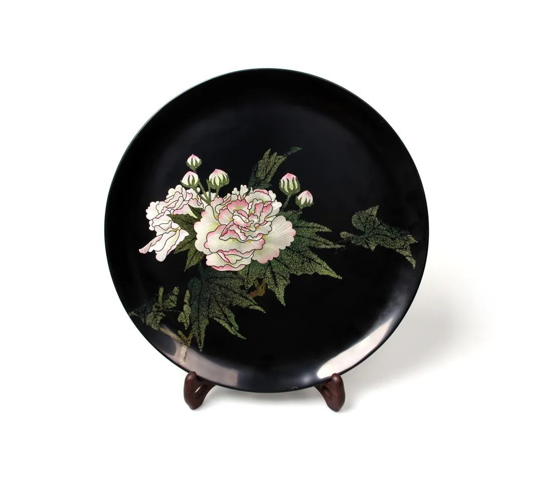 成都漆艺的现代作品左:雕银丝光晕彩芙蓉圆盘;右:雕银丝光晕彩银杏圆盘