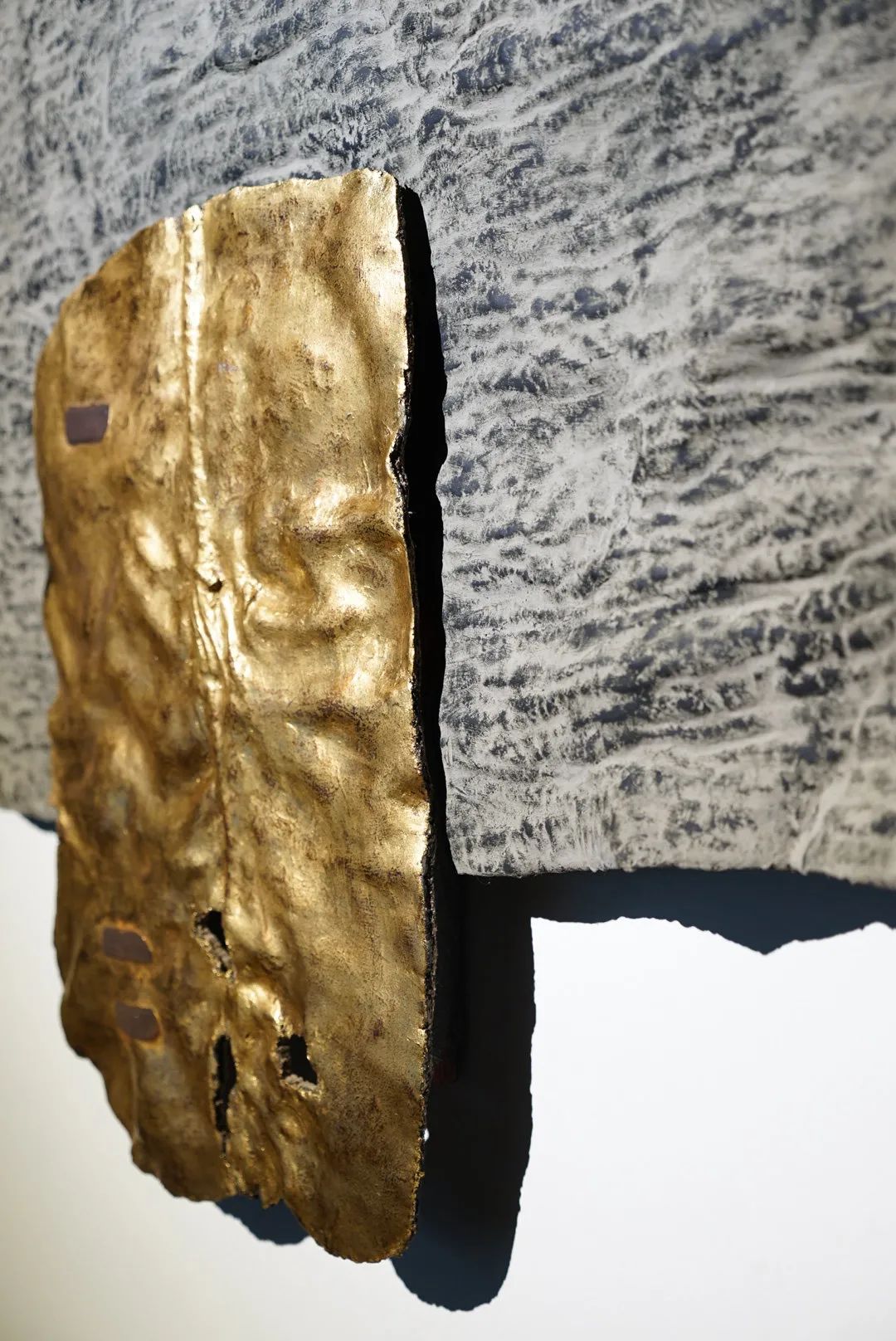 他在米袋、棉布上刷上一层层清漆,再贴上金箔、银箔,或者脱胎于竹器、水泥地板等的干漆,再在干漆上创作。