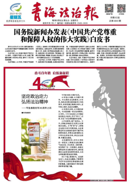 澎湃新闻记者注意到,6月25日出版的《青海法治报》在头版刊文《坚定政治定力 弘扬法治精神——写在本报创刊40周年之际》。文章写道:今天,《青海法制报》正式更名为《青海法治报》。从“制”到“治”,《青海法治报》与时代同频共振,为全面推进依法治国肩负起时代赋予的职责和使命,发挥法治新闻舆论主力军和主阵地作用,讲述法治故事、传播法治强音。