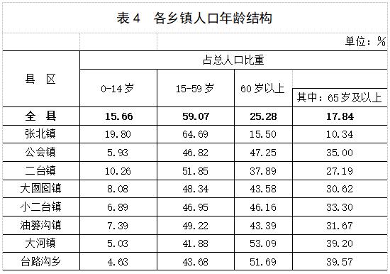 全县常住人口中,0-14岁[4]人口为48357人,占15.66%;15-59岁人口为182446人,占59.07%;60岁及以上人口为78077人,占25.28%,其中65岁及以上人口为55116人,占17.84%。与2010年第六次全国人口普查相比,0-14岁人口的比重下降0.50个百分点,15-59岁人口的比重下降8.30个百分点,60岁及以上人口的比重上升8.81个百分点,65岁及以上人口的比重上升7.17个百分点。