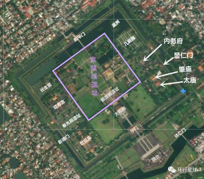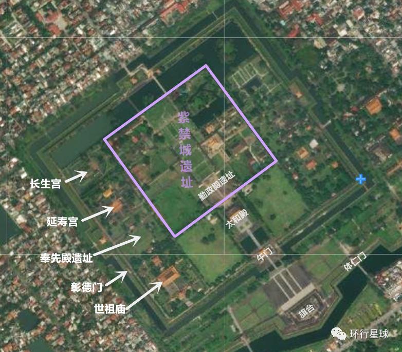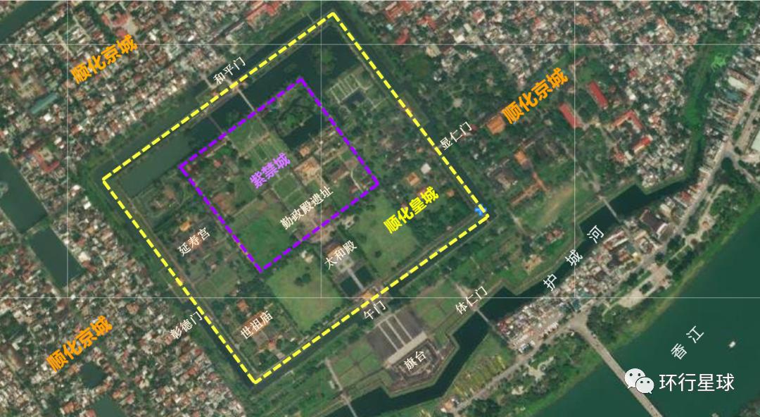 顺化皇城基本是仿照北京故宫的布局,北京故宫中间有一条中轴线贯穿整个皇宫。顺化皇城也有一条中轴线,但顺化皇城的中轴线并不是南北方向,而是面对香江,约有30度角的倾斜。顺化皇城的鸟瞰图