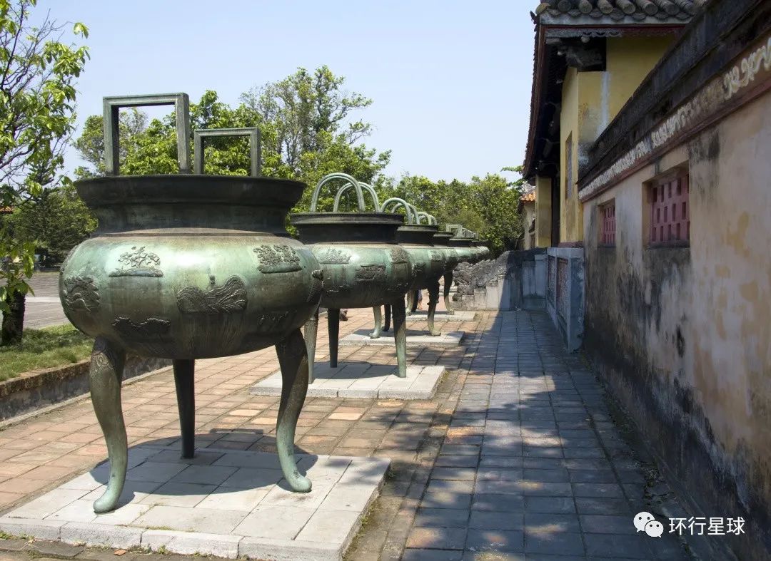 在世祖庙前面,有九座大铜鼎,是明命帝于1835年铸造的,每个重达2吨左右,鼎上刻有山川海洋、日月星辰等图案,代表了阮氏王朝江山永固。九鼎