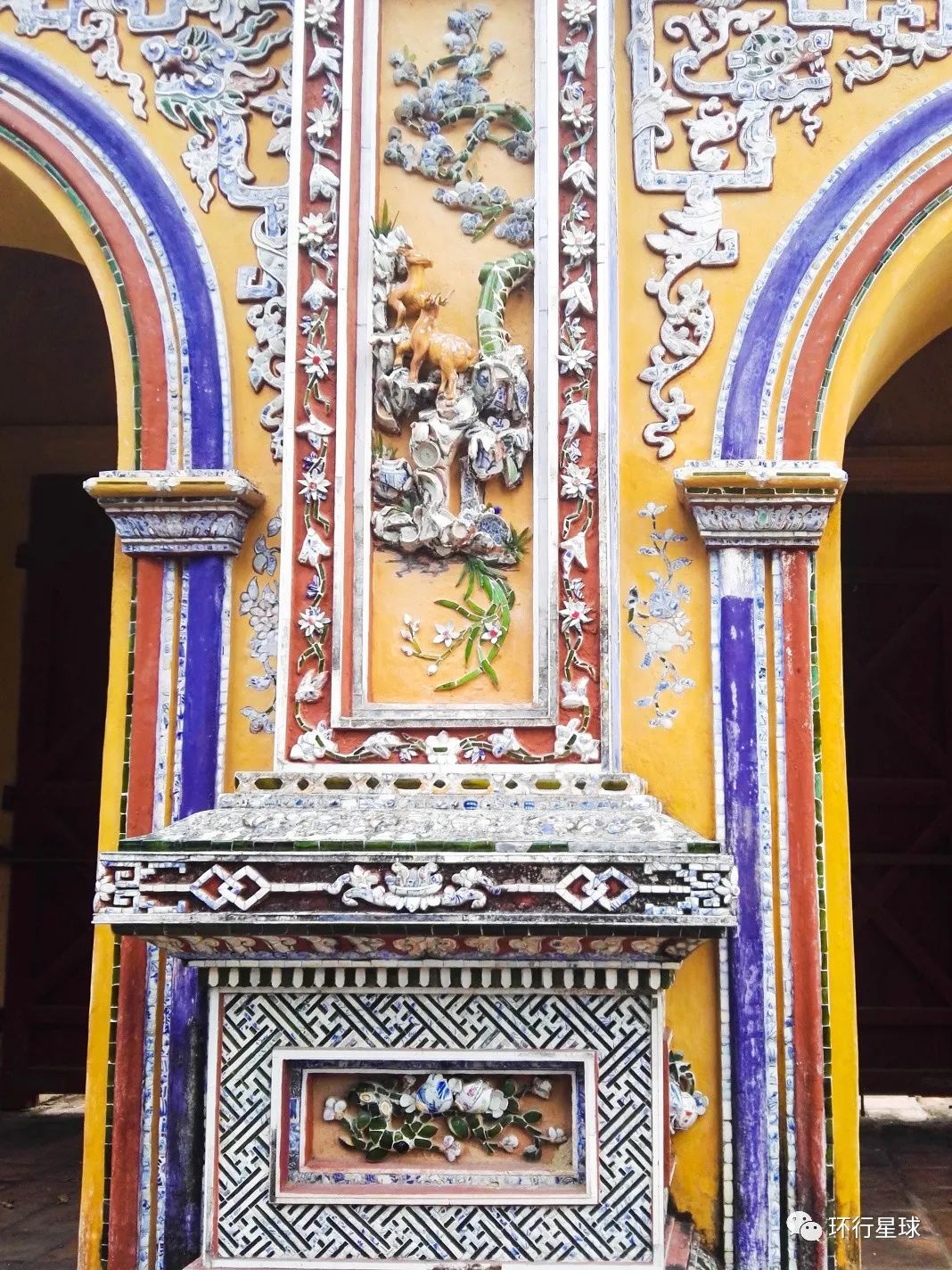 内务府往前走几步,就是皇城的东门显仁门了。显仁门上的嵌瓷工艺非常漂亮,嵌瓷在顺化皇城内几乎随处可见,它是将各种颜色的瓷器敲碎,剪取成特殊形状的瓷片,镶嵌组合成各种图案,装饰在建筑上的精美艺术品。显仁门