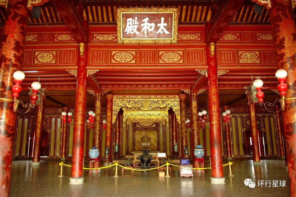 太和殿正中设有皇帝宝座,上面悬挂着“太和殿”匾额,红底金字。顺化皇城太和殿内部