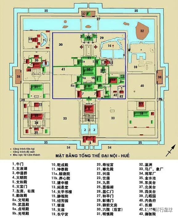 在紫禁城东北角,是御花园邵芳园。邵芳园东面的几暇园,也是皇家花园,园北为一片湖泊,湖中有瀛洲岛。景区也显得有些荒凉,在水边走了一会儿,便开始参观皇城的西路建筑。顺化皇城平面图。图中红色为重新修复的建筑,绿色为废墟。其中14太平楼为战争中遗留的完整建筑,不是废墟。