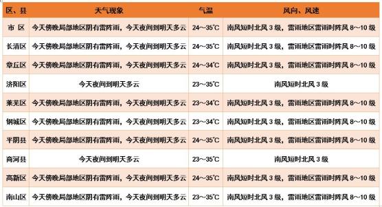 济南市气象台6月27日16时发布的区、县预报: