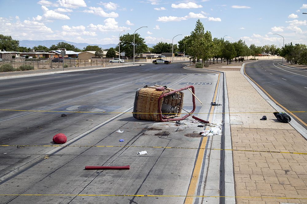 当地时间2021年6月26日,在美国新墨西哥州阿尔伯克基拍摄的热气球坠毁事故现场。美国南部新墨西哥州26日发生一起热气球撞上电线后坠毁事故,造成4人死亡、1人重伤。