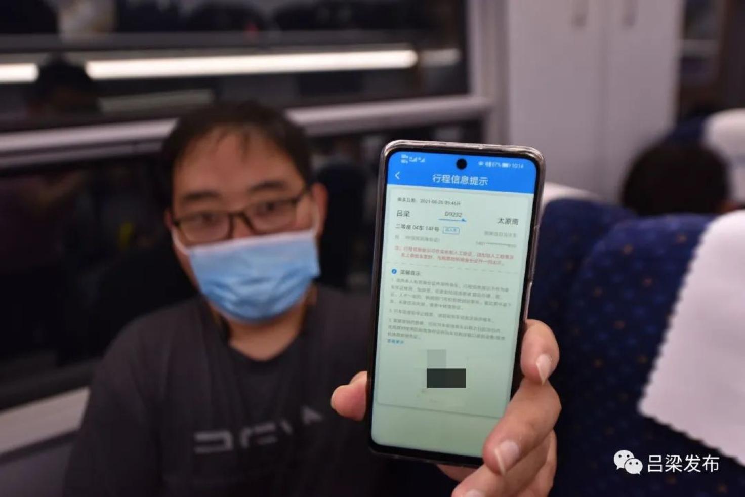▲“打卡”乘客展示电子客票为助力乡村振兴,让吕梁革命老区人民出行更加舒适便捷,今年3月份起,铁路部门开始对太中银铁路太原南至柳林南段198公里的线路和设施设备开始全面升级改造,开行太原南至柳林南区段动车组列车。