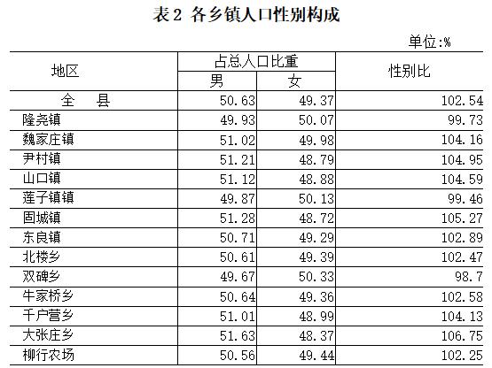 二、人口性别构成情况全县常住人口中,男性人口为243237人,占50.63 %;女性人口为237210人,占49.37 %。总人口性别比(以女性为100,男性对女性的比例)为102.54 ,比2010年第六次全国人口普查上升2.82。