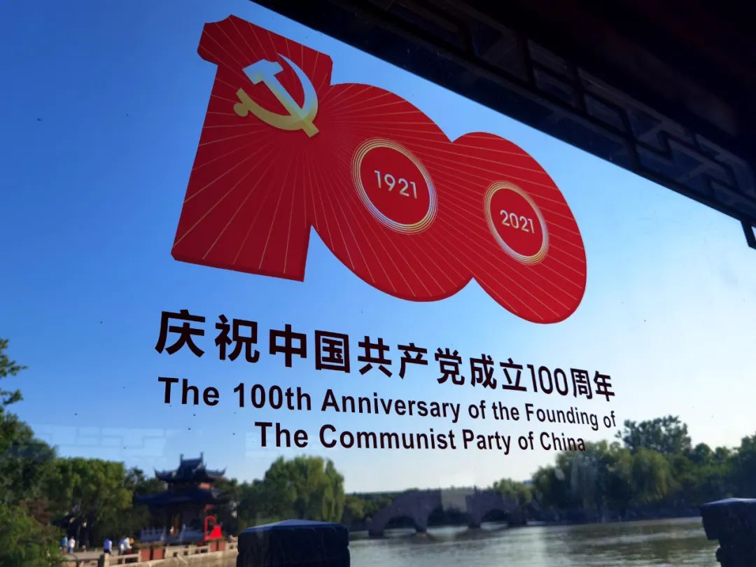 ▲南湖游船上张贴着喜迎建党100周年的标志前来瞻仰红船的人们,还会去坐落于南湖之畔的南湖革命纪念馆。