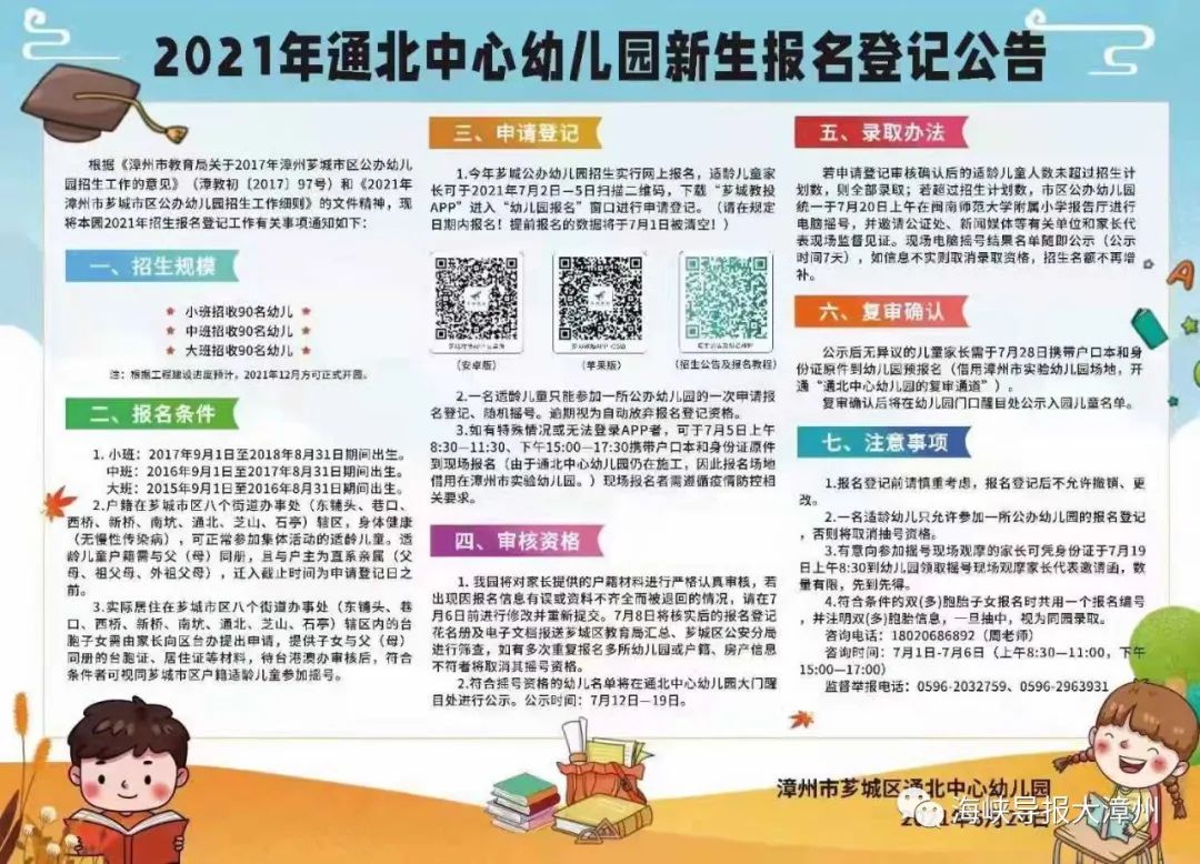 1.今年幼儿园招生实行网上报名,适龄儿童家长可下载“芗城教投APP”进入“幼儿园报名”窗口进行申请登记。报名时间段为: