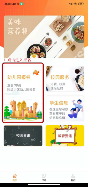1.报名入口:点击【首页】—【幼儿园报名】。
