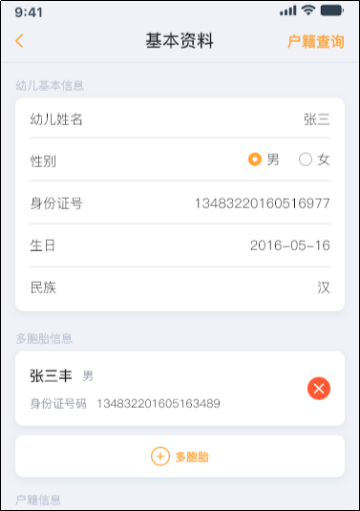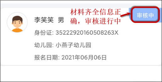 ①信息框右上角显示当前【审核中】状态,报名信息待幼儿园与教育部门审核,审核中的数据不能进行修改。