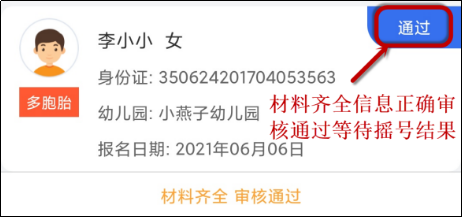 ②信息框右上角显示当前【通过】状态,报名信息已审核完毕,待摇号,通过后的数据不能进行修改。