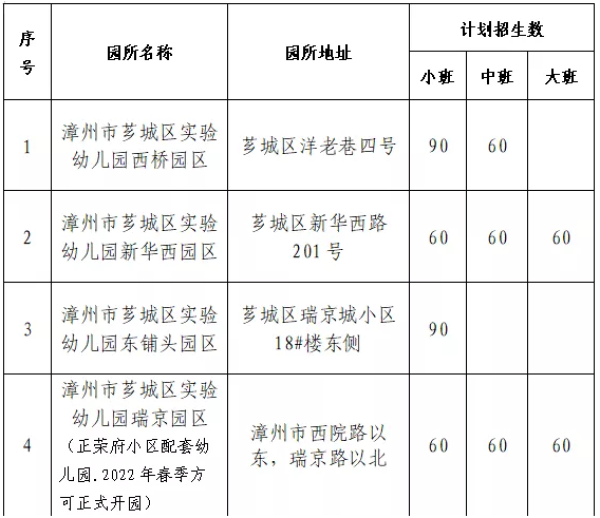 今年芗城区实验幼儿园西桥园区、新华西园区和东铺头园区都有计划招生,瑞京园区将于2022年春季招生。具体招生计划如下:
