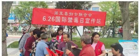 6月25日上午,周至县妇联组织巾帼志愿者在县八云塔广场开展“6·26国际禁毒日”宣传活动,通过悬挂禁毒标语、摆放宣传展板、发放宣传彩页、向现场群众讲解禁毒知识并赠送宣传礼品等形式,进一步提高全民识毒、防毒、拒毒的能力,营造人人参与禁毒斗争的浓厚氛围。