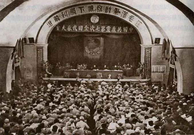 1945年4月至6月,中国共产党第七次全国代表大会在延安召开,会场上第一次悬挂了党旗,结束了党从“一大”到“六大”没有正式党旗的历史。主席台中间第一次缀有了党徽:锤头镰刀,稻穗和麦穗围绕着它。两边分别插着数面鲜红的、缀有锤头镰刀的党旗。