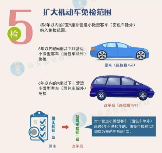 在实行6年内6座以下非营运小微型载客汽车免检基础上,将6年以内的7至9座非营运小微型等载客汽车(面包车除外)纳入免检范围。