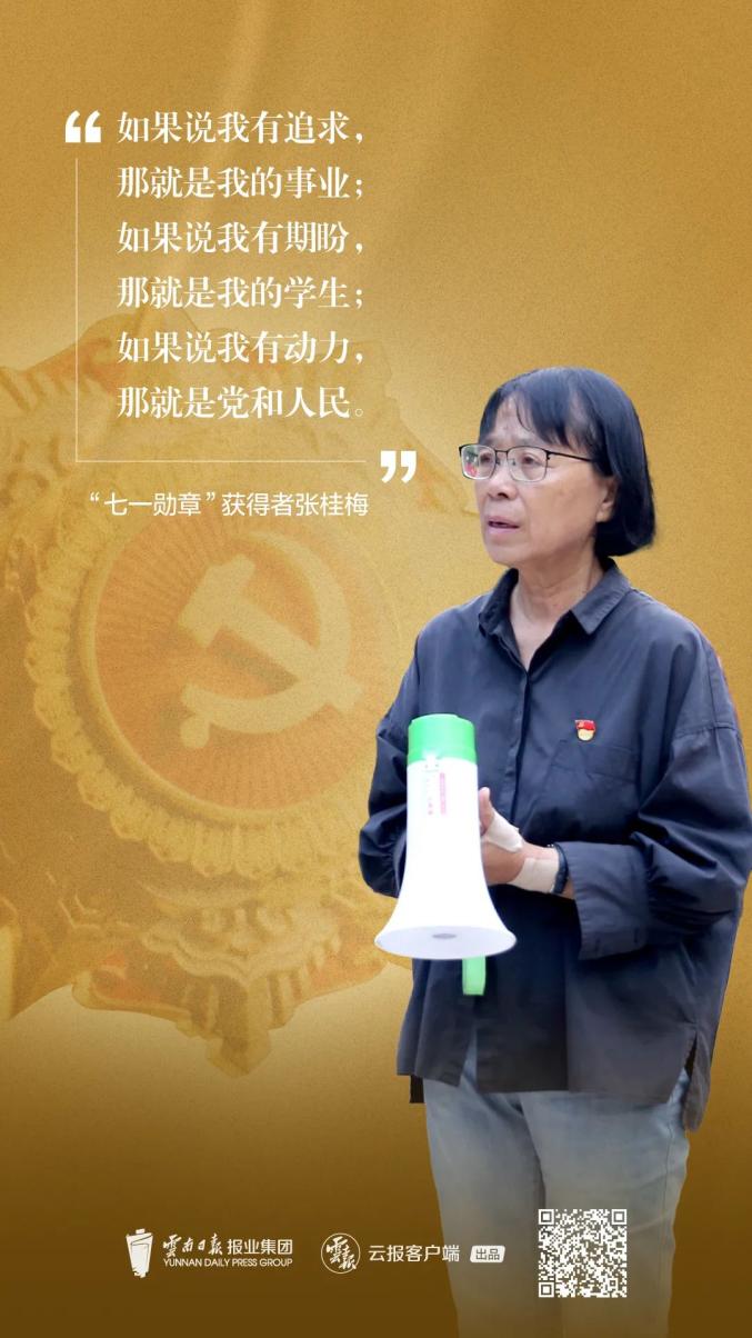 云南省丽江华坪女子高级中学党支部书记、校长,华坪县儿童福利院院长张桂梅代表“七一勋章”获得者发言。她说:“只要还有一口气,我就要站在讲台上,倾尽全力、奉献所有,九死亦无悔!”
