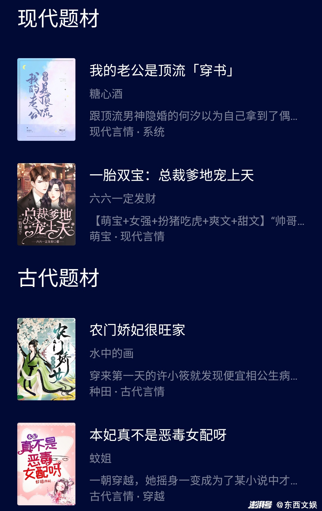 从目前释出的作品信息来看,IP版权主要分为现代、古代题材。无论是“系统”、“快穿”还是“历史穿越”,可以很鲜明的看到“穿越”题材是此次释放版权的重点类型,此外种田、复仇、重生等已经历短剧市场反复检验的元素也出现在版权当中。