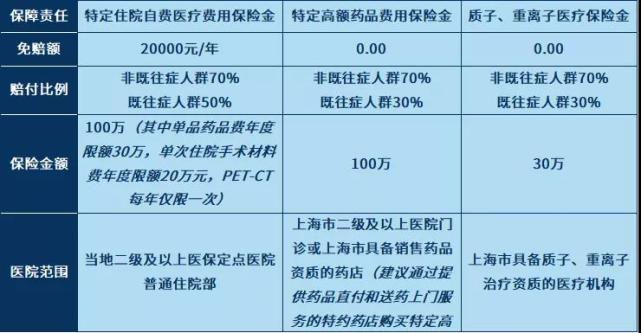 ① 特定住院自费医疗费用赔付金额=(住院期间发生的经基本医保结算的发票中自费医疗费用中的特定药品费、手术材料和检查费-2万元免赔额)×70%,既往症人群报销比例为50%。年度限额100万,其中单品药品费年度限额30万,单次住院手术材料费年度限额20万元,PET-CT每年仅限一次。