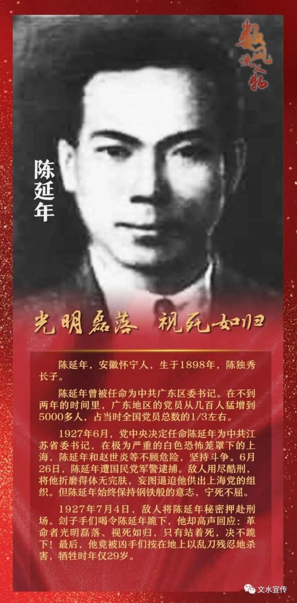 陈延年不仅是热血青年,更是革命烈士,是党的忠诚战士。1927年春,陈延年赴武汉参加中国共产党第五次全国代表大会时,被任命为中共江浙区委书记,他当即转赴上海,途中上海发生四一二反革命政变。