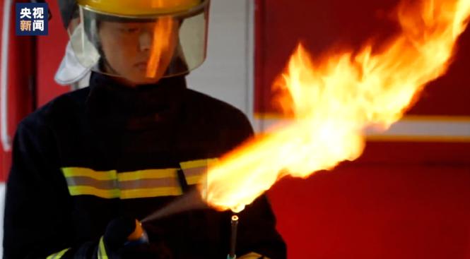 消防员先拿起其中一款防晒喷雾,对着空中进行喷洒,然后打着点火器。当有明火靠近时,立刻发生了燃烧。