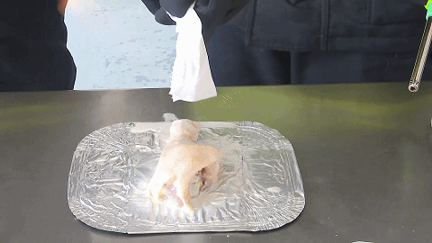 如果这些防晒喷雾喷到了人的皮肤上,再接触到明火,还会燃烧吗?消防员找来鸡腿模拟人的皮肤。在喷上防晒喷雾,约5秒后,消防员拿出点火器点火,此时鸡腿突然着火,还伴有滋滋的声响。