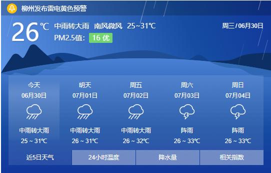 柳州水文中心6月30日20时发布水文信息:过去12小时,我市大部分地区出现强降雨过程,最大累计降雨量为柳城县东泉镇73.5毫米。受27日以来的持续强降雨影响,我市辖区内大部分河流出现了明显的涨水过程。20时,各河段水位均在警戒线以下,柳江柳州水文站水位79.16米,河水已漫至广雅大桥下的滨江西路延长线,提醒广大市民注意出行安全。预计,未来12小时柳江柳州水文站水位在79.5米以下。