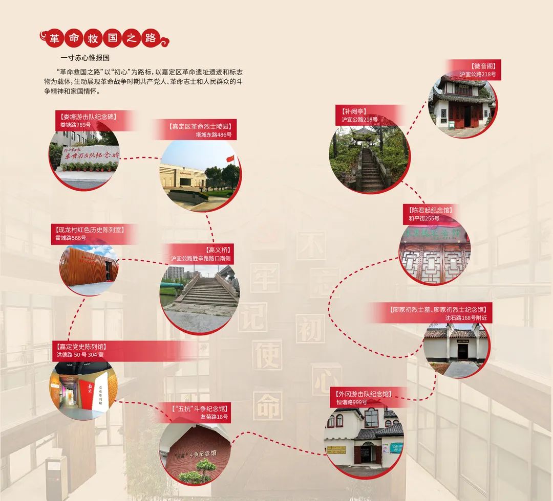 “革命救国之路”以“初心”为路标,以嘉定区革命遗址遗迹和标志物为载体,生动展现革命战争时期共产党人、革命志士和人民群众的斗争精神和家国情怀。