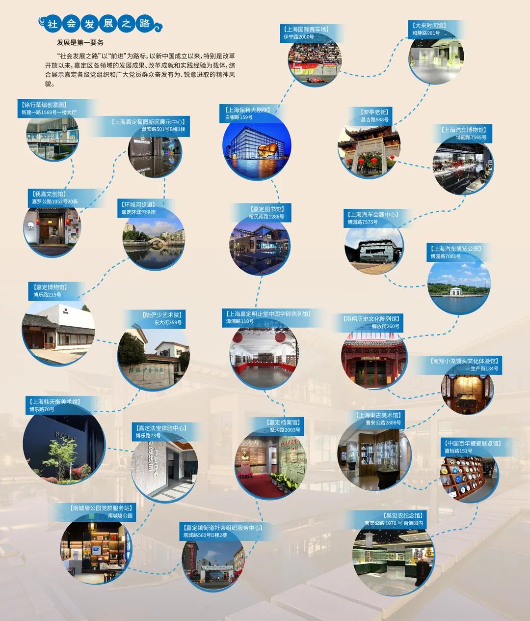 02.社会发展之路“社会发展之路”以“前进”为路标,以新中国成立以来,特别是改革开放以来,嘉定各领域的发展成果、改革成就和实践经验为载体,综合展示嘉定各级党组织和广大党员群众奋发有为、锐意进取的精神风貌。