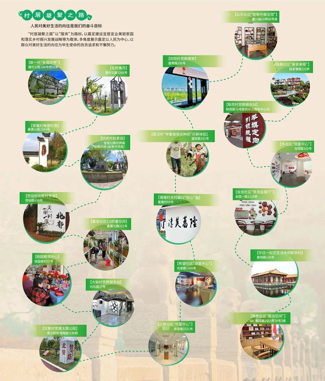 04.村居凝聚之路“村居凝聚之路”以“服务”为路标,以嘉定建设宜居宜业美丽家园和落实乡村振兴发展战略等为载体,多角度展示嘉定以人民为中心、以群众对美好生活的向往为使命的孜孜追求和不懈努力。