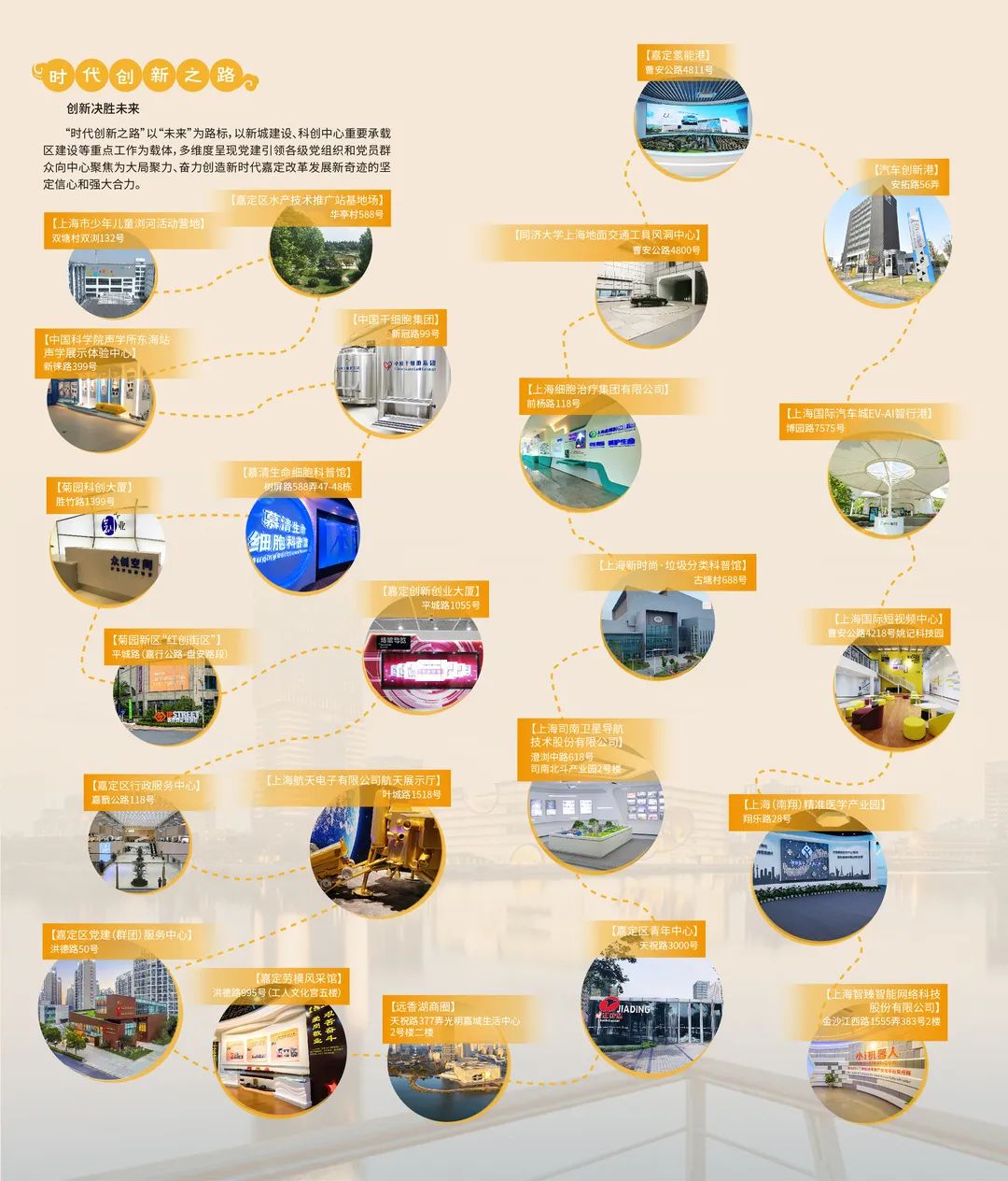 05.时代创新之路“时代创新之路”以“未来”为路标,以新城建设、科创中心重要承载区建设等重点工作为载体,多维度呈现党建引领各级党组织和党员群众向中心聚焦为大局聚力、奋力创造新时代嘉定改革发展新奇迹的坚定信心和强大合力。