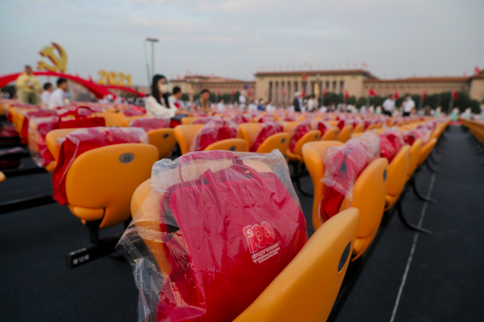 今天(7月1日)上午,在庆祝中国共产党成立100周年大会现场,当参会人员陆续进入天安门广场走到观礼台时,最先看到的是每个座椅上都摆放着一个精致、漂亮的小包。包身两面分别是“庆祝中国共产党成立100周年”字样和一个“100周年”的标志。