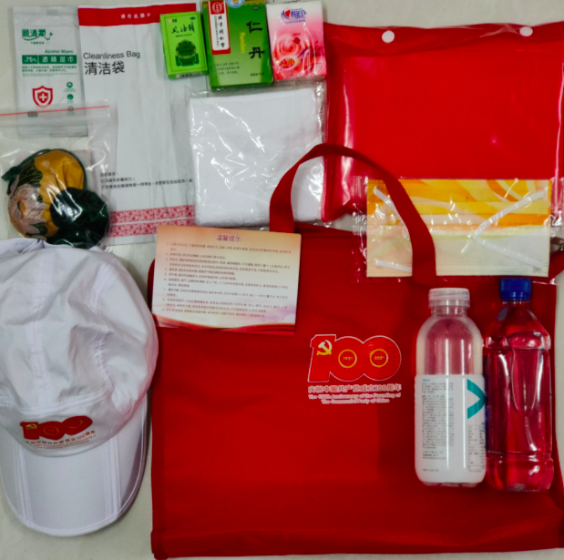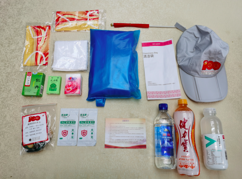 包里另有一面卷起来的小旗,分为国旗和党旗两种,随机发放;一张温馨提示卡,内容主要是围绕饮食、防暑、防感冒等方面的建议,并告知当身体出现问题时该如何报告;另外还有一个纸制垃圾袋。