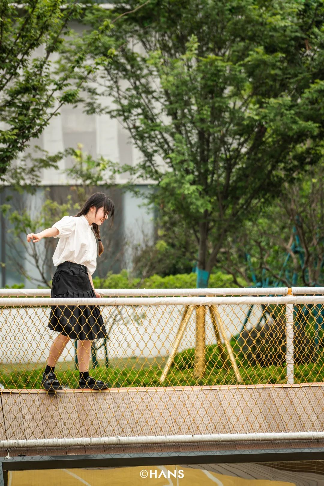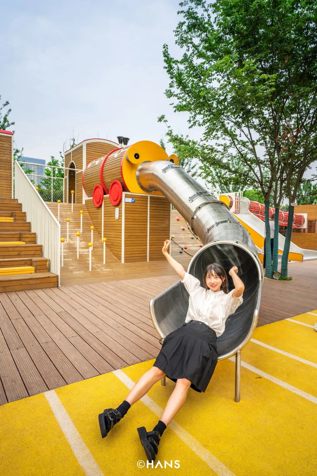 临走的时候,看到一位爹爹提着水壶牵着孙女来玩,只见他一放手,小女孩“哇”的欢呼一声,钻进滑滑梯消失不见,爹爹悠闲地找了个林荫处玩手机。我问爹爹是常来这里遛弯吗?“那肯定咧,原来溜伢只能去墨水湖公园,还要时刻牵在身边,蚊子也多,像这样的地方要多开,要是有个象棋桌子就更好了。”