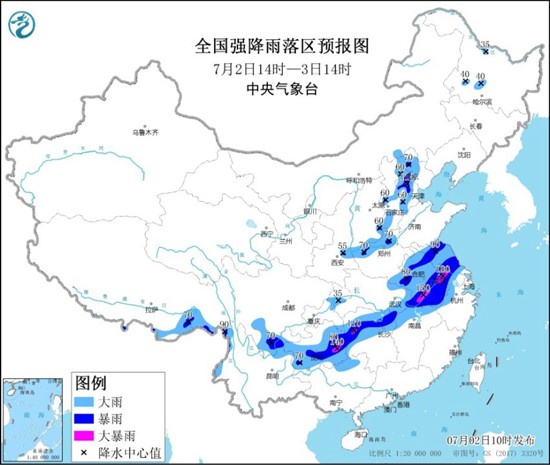 中央气象台7月2日-3日全国强降雨落区预报图 图片来源:中央气象台