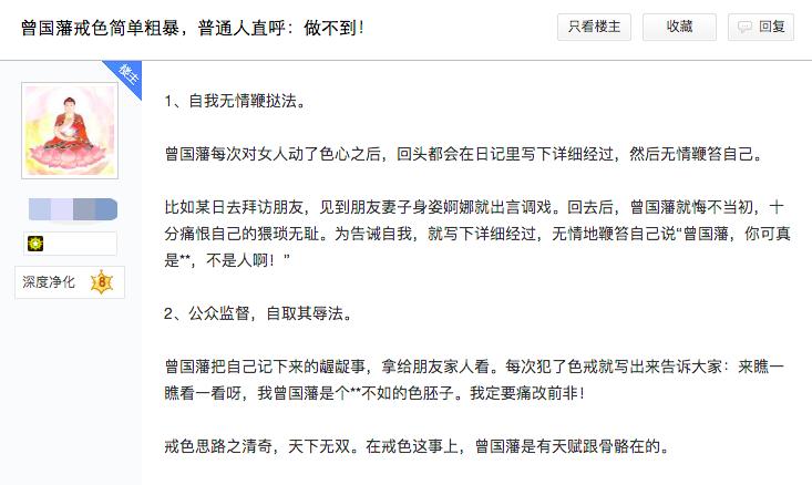 吧友们有个精神偶像曾国藩。吧内传闻,曾国藩实为戒色鼻祖,一起邪淫便公之于众,主动社死,以此杜绝自己色心再起。