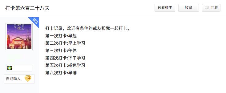 戒色吧里的吧友们,平时以师兄弟相称。同在一门内,修的都是戒色这门功夫。像减肥、早起、学英语一样,师兄弟们也会在吧里直播打卡,请大家监督。